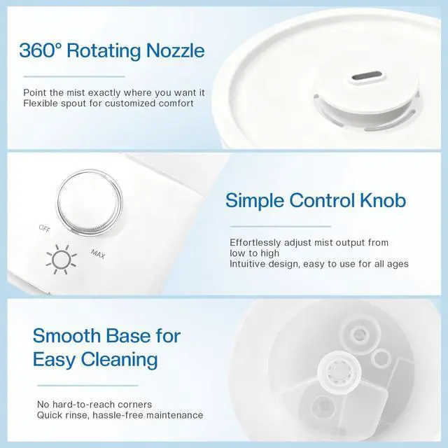 Precise Mist Control with Knob Dial Adjust the mist output effortlessly using the intuitive control knob. From light mist to high output, find the perfect level for your room or plant needs.