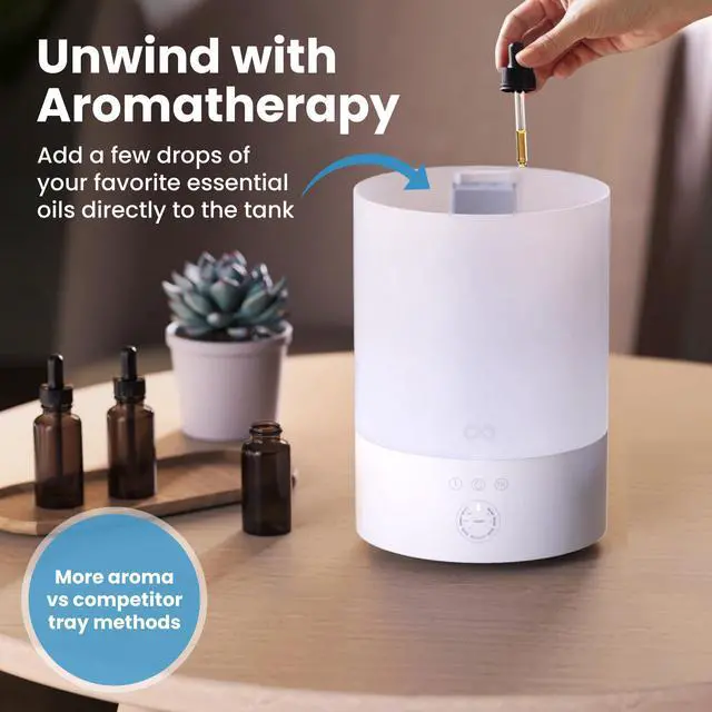 CUSTOM MIST LEVELS AT YOUR FINGERTIPS: Choose from three adjustable mist levels with our easy touch feature - high, medium, or low - for custom humidity control that adapts to your needs. Use for bedrooms, as a baby humidifier for nursery - these diffusers even work for indoor houseplants or living rooms. This ultrasonic humidifier delivers the right amount of cool mist exactly where you need it. Helps with congestion, dry skin, allergies, for a comfortable environment year-round