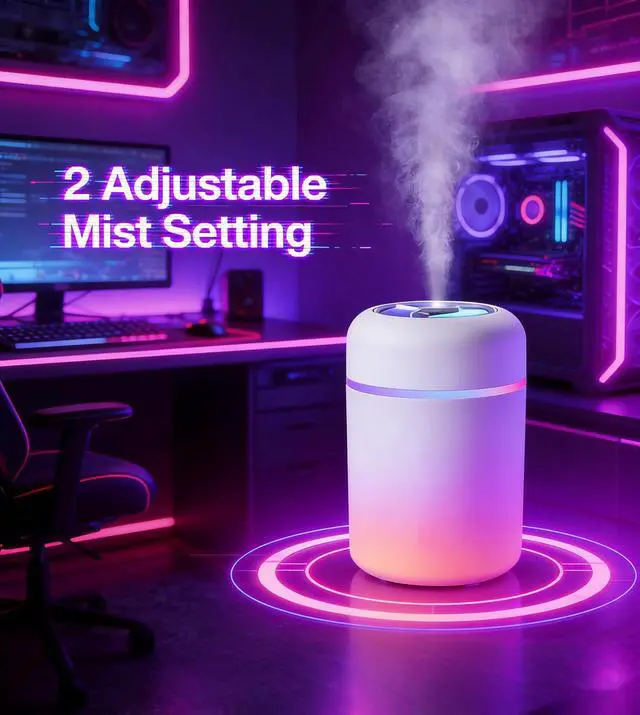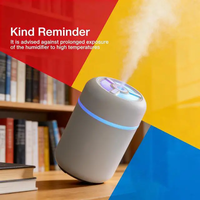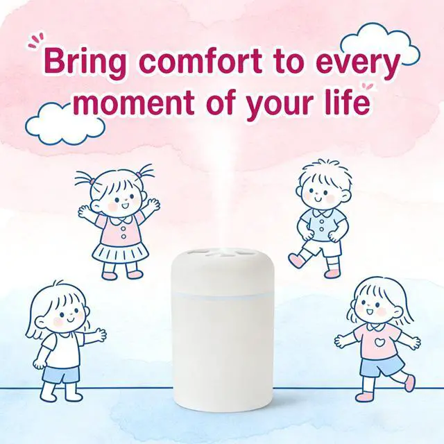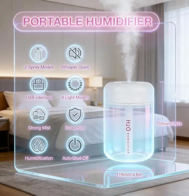 Compact Mini Humidifier with Color Cycling LightMeasuring 3.1IN3.1IN4.6IN, this lightweight and portable humidifier is easy to carry for use in bedrooms, offices, cars, or during travel. It features a color cycling light that creates a calm ambiance, adding a gentle decorative touch to your space. Whisper-Quiet Ultrasonic Operation & Dual Spray ModesEquipped with ultrasonic technology, this humidifier runs at a low 26dB, ensuring a quiet environment for rest, work, or study. It offers two spray modes: continuous mist (runs for 4 hours) and intermittent mist (runs for 8 hours), allowing you to adjust moisture output based on your needs. One-Button Control & Auto Shut-Off Safety FeatureOperation is simple with a single button: press briefly to switch between spray modes, and hold for 3 seconds to control the color lights. The humidifier is built with an auto shut-off function that activates when the water level is low, preventing damage and enhancing overall safety during use. Hydrating for Skin & Small PlantsThis cool mist humidifier adds gentle moisture to dry air, helping to ease skin dryness and discomfort. It can also be used to provide targeted hydration for small indoor plants, supporting their healthy growth in dry environments. USB-Powered & BPA-Free Safe MaterialPowered by a USB port, this humidifier is compatible with most USB-enabled devices for flexible use at home, in the office, or on the go. Crafted from high-grade, BPA-free PP material, it is safe for households with babies and pets, and the smooth surface makes it easy to clean and maintain. It also serves as a practical gift option for family and friends.