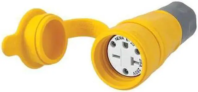Watertight Straight Blade Connector, Connection Orientation Straight, Current Rating 20 A, Housing Color Yellow, NEMA Receptacle Configuration 6-20R, Number of Poles 2, Number of Wires 3, Phase Single, Resistance Properties Corrosion Resistant, Impact Resistant, Voltage Rating 250V AC, Wire Connection Type Screw Terminals, Cap Type Press-On Cap, For Maximum Cable Diameter 0.63 in, For Minimum Cable Diameter 0.38 in, Grade General Use, Grounding Grounded, Horsepower Rating 1 hp