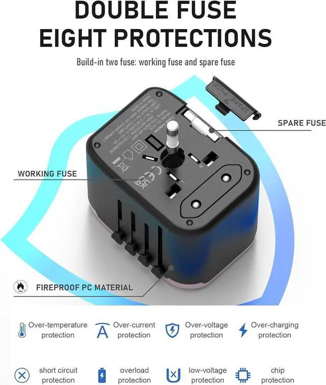 Universal power adapter has built-in 8A fuse to effectively prevent overcharging and short circuit, with FCC, CE and RoHS certified safety system, adjust the correct current output and automatically boost the charging speed, the port automatically adapts to the output of each device, our built-in safety shutter will also protect your electronics from harm