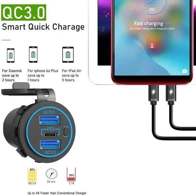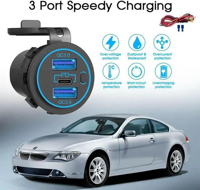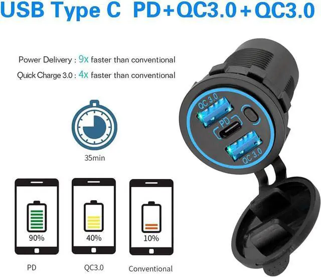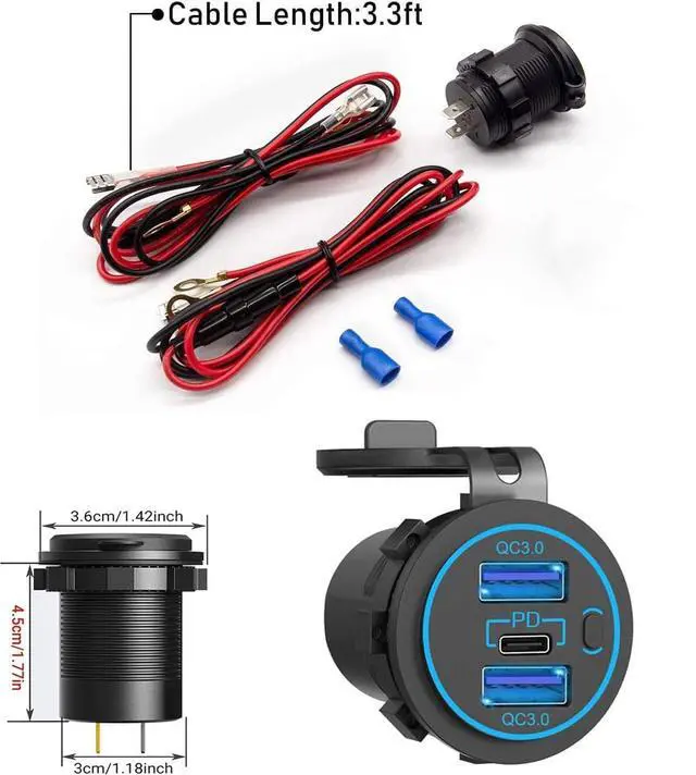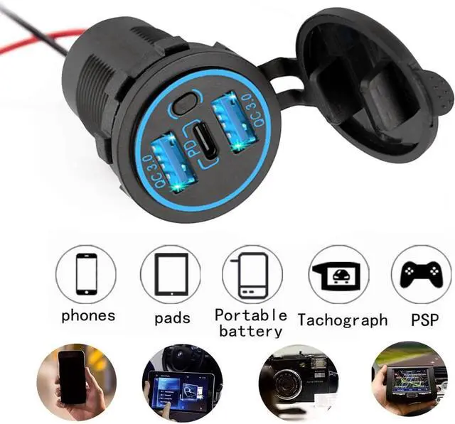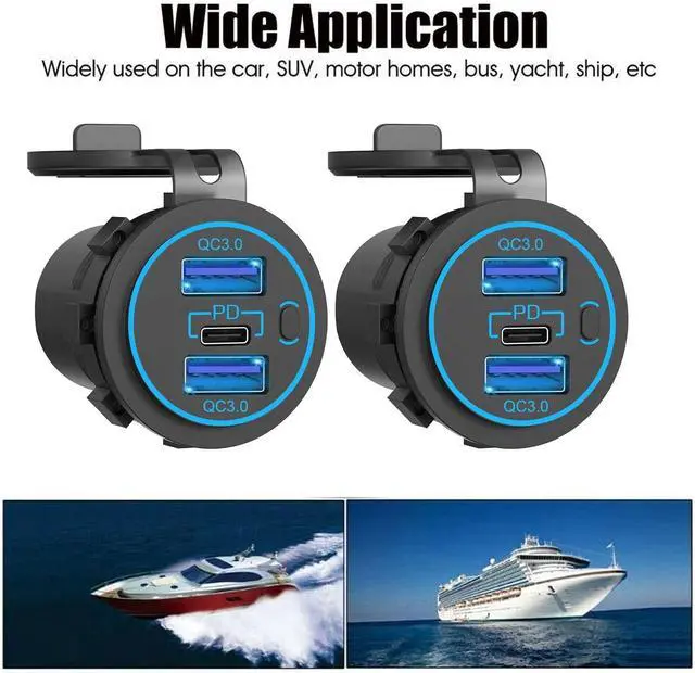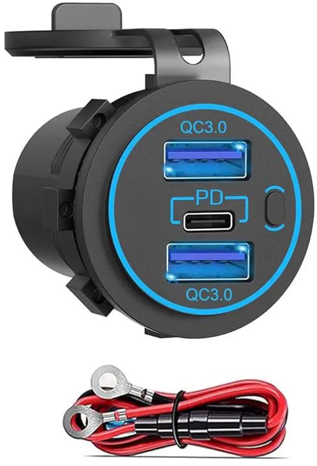 12v usb charger, PD 20W USB-C Power Socket and 18W QC3.0 Socket Waterproof Power Outlet 12V/24V with Power Switch 12V USB C Outlet for Car Golf Cart Boat Marine Bus Truck RV Marine Motorcycle etc.