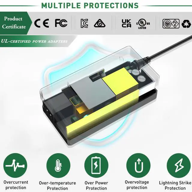 | Certificate: | Compliant with electrical safety standards including UL, CE, FCC, SAA, KC, PSE, UKCA, and RoHS, as well as VI energy efficiency, it features overcurrent, overcharge, temperature, short circuit, and overvoltage protection to better safeguard your equipment. |