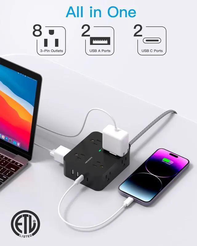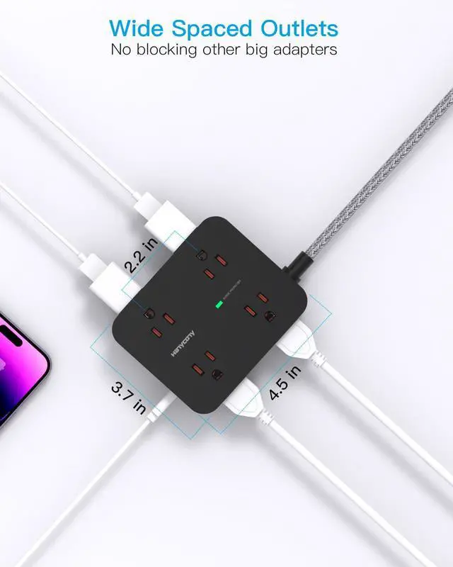 3 Side design 8 widely spaced AC outlets can fit for larger adapters without blocking each other. The compact design saves more space, suitable for the home, office, and college dorm room