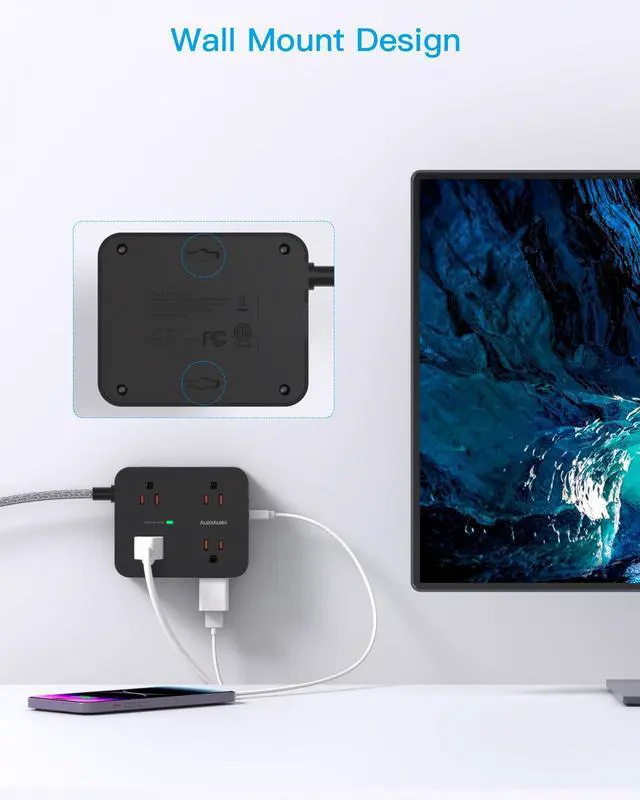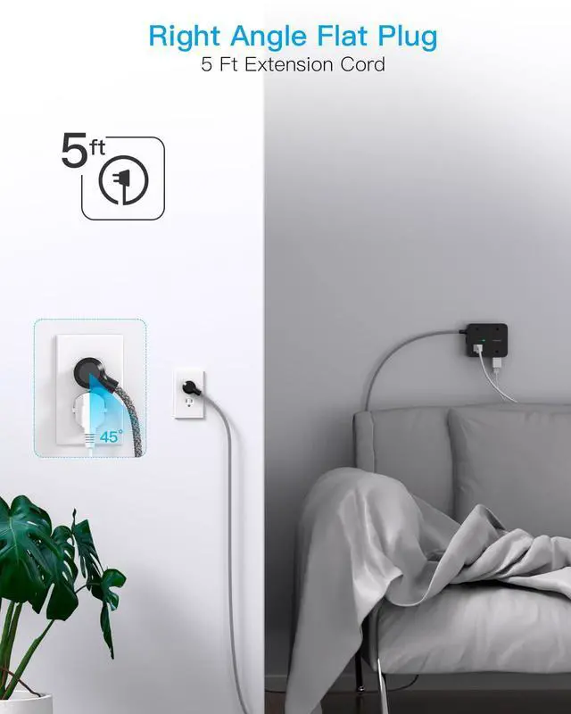 Wall mount design and right angle flat plug with 5ft extension cord can allow you install this power strip on various places, its a great desk or wall usb charging station for phone, tablet, PC, TV and more.