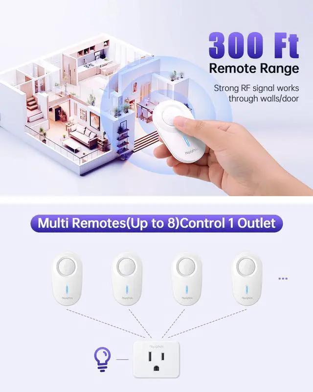 300FT RF Long Range ControlOur wireless light switch has a strong RF signal, which can work through doors and walls without interfering with other electronics. The strong signal supports distance control of 70-160ft indoors and 300ft outdoors. You can control the switch of sockets from anywhere in your home. Suitable for living room, bedroom, kitchen, office, garage etc