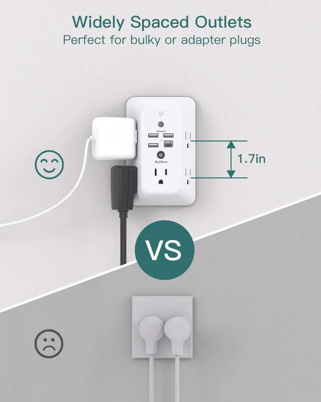 3-sided wide spaced 5 AC outlets to accommodate oversized power adapters without blocking other outlets. Larger spacing makes it easier to use for all kinds of equipment.