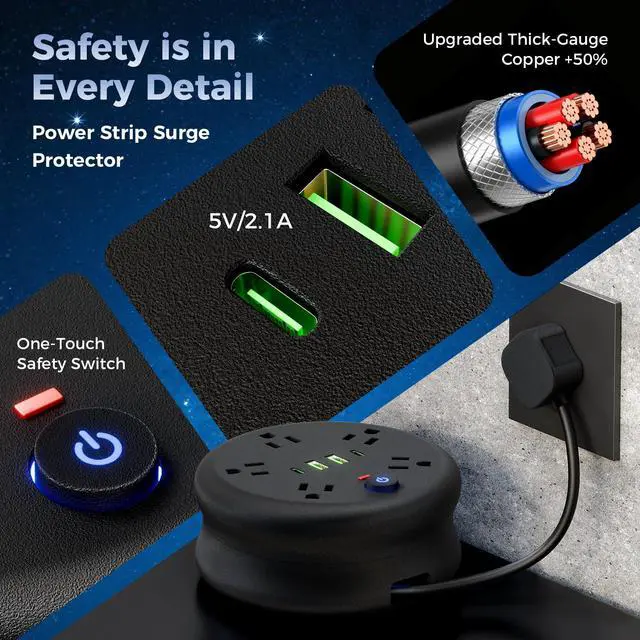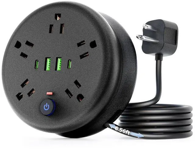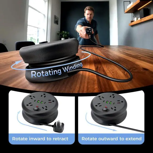 Retractable FunctionalityThis 6.56ft power strip comes with a retractable cord. You can easily adjust the cord length based on your actual needs, making the most of your space. When not in use, retract it fully to a compact size. It's not only easy to carry around but also helps you keep your place tidy without the mess of tangled cords.