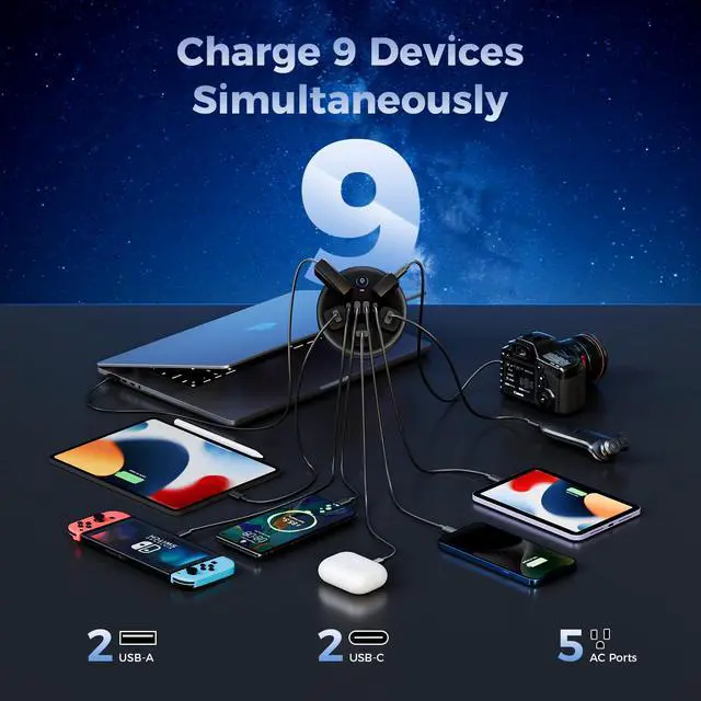 9 - in - 1 Charging SolutionPATDEENREE travel power strip has 5 AC outlets, 2 USB-C ports, and 2 USB-A ports. Max power: 1920W (120V-16A), which provides power and charging for up to 9 devices. This travel extension cord is the perfect choice for charging multiple devices while traveling or at home.