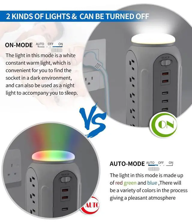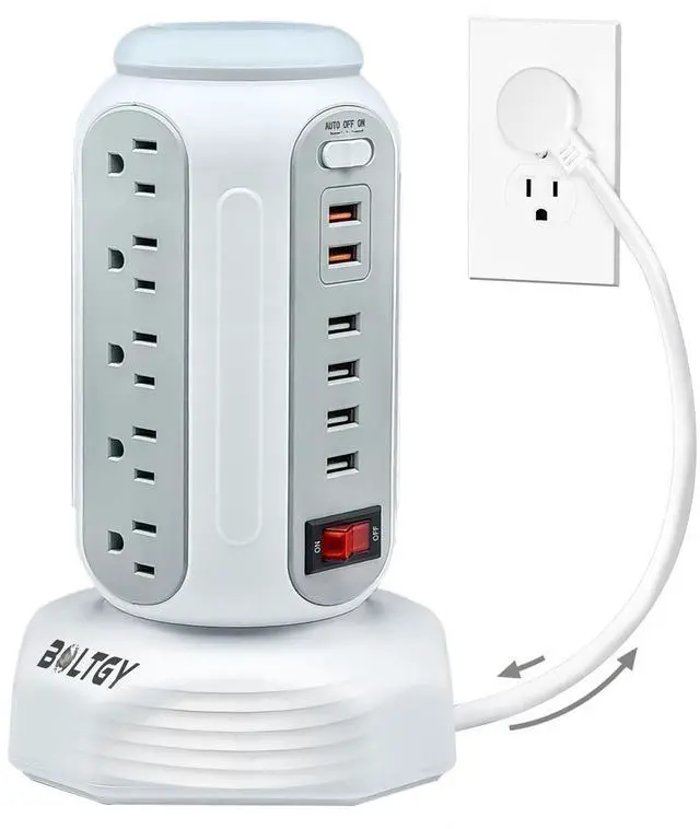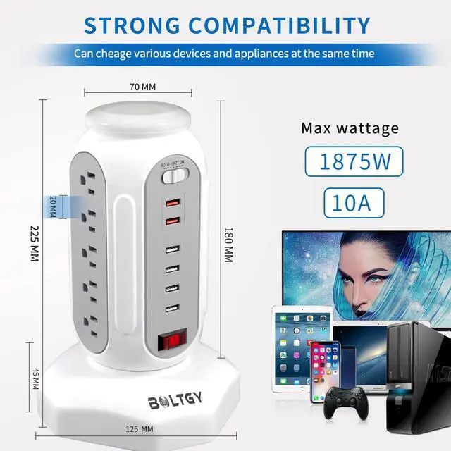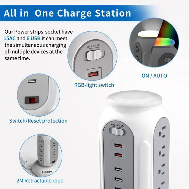 Features 15 AC power outlets and 6 USB slots, two of which are fast-charging slots for charging cell phones, Airpods, smartwatches, tablets, computers, laptops, TVs, desk lamps, printers, scanners, and other home/office devices.