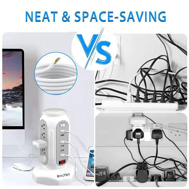 The 6.0-foot extension cord hides in the base of this vertical power outlet, so you can better organize the excess cables that clutter this vertical power outlet and keep your room organized!