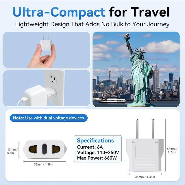 | EU, UK, AUS/NZ, Asia to US | EU/Schuko to US | EU (round prongs) | EU/Schuko to US | EU (round prongs) |