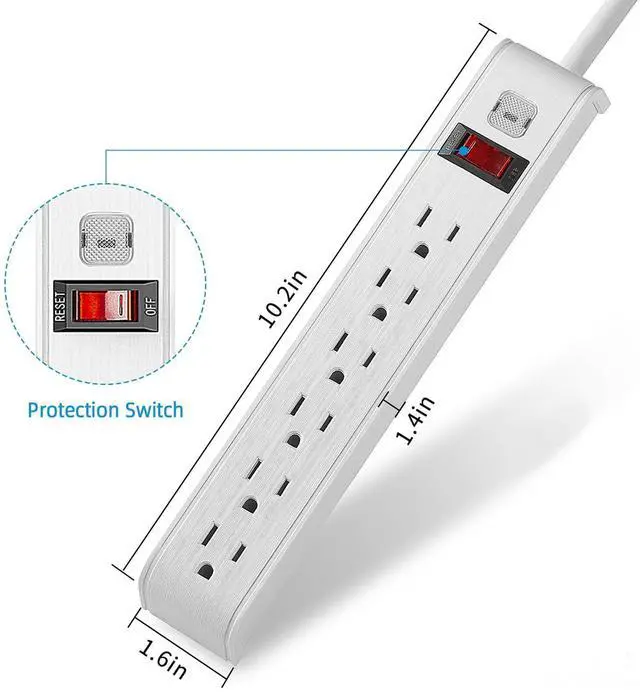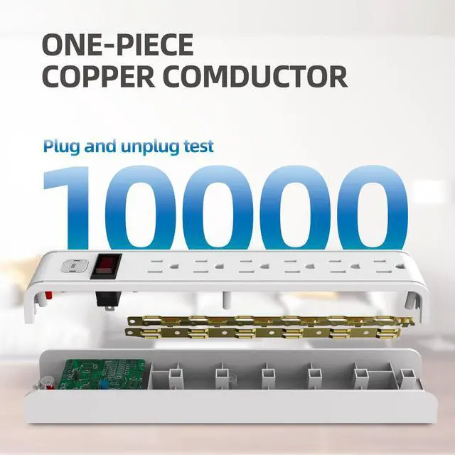 6-Outlet Surge Protector Power Strip: 6 AC outlets with surge protection , protect your device from spikes and surges; Use integrated copper strips for tighter plug insertion and prevent the risk of short circuits.
