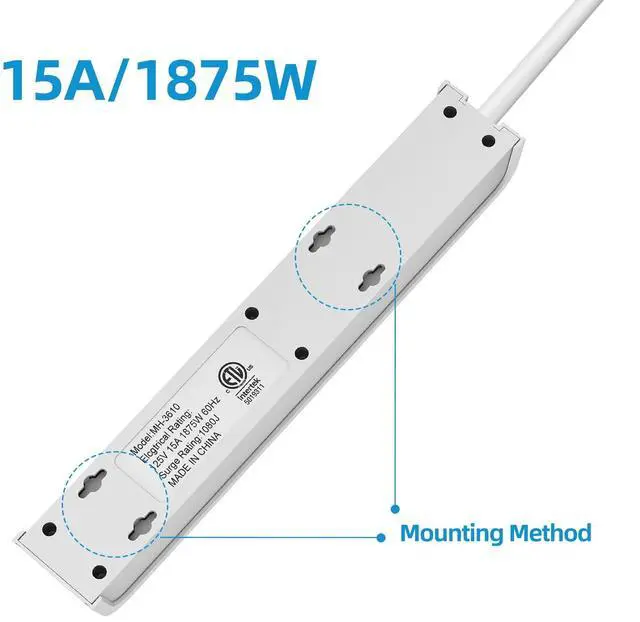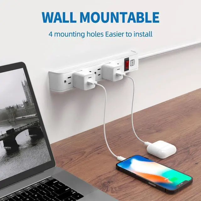 Wall Mount Outlet Strip: Four solid mounting holes on the back, make it easier to install, perfect for home, office and dorm.