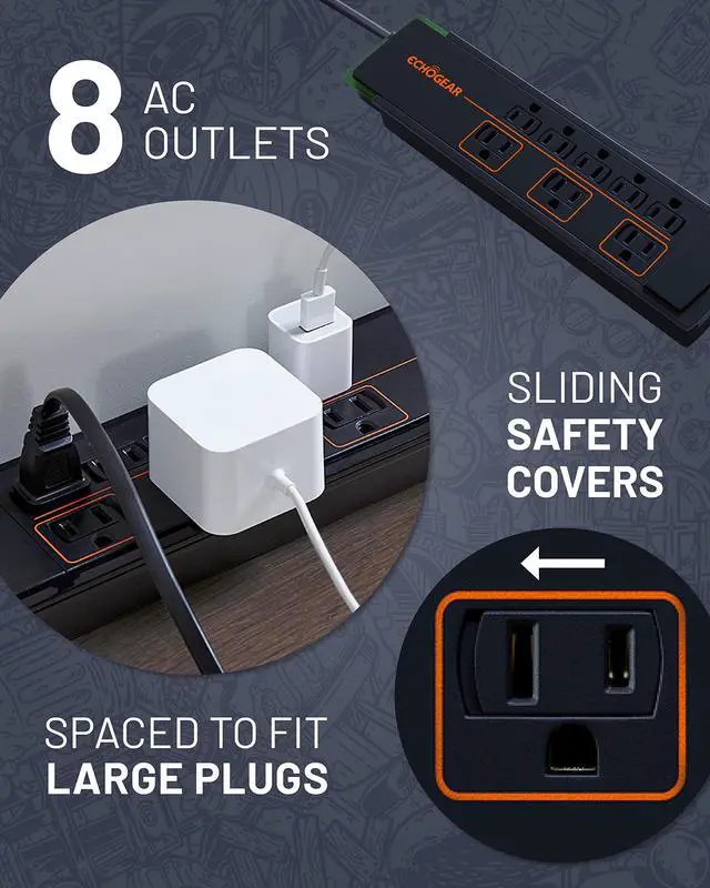 It's an absolute sham that standard outlets only have 2 plugs. Should you have to choose between powering up the Xbox or the soundbar? We're going to let Randy Jackson answer this one: "That's gonna be a no for me, dawg." Power and protect 8 of your devices at once with an Echogear surge suppressor. What makes these better than cheap knock-offs? Buckle up: