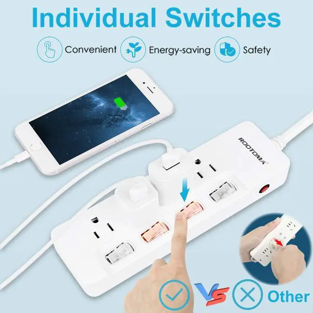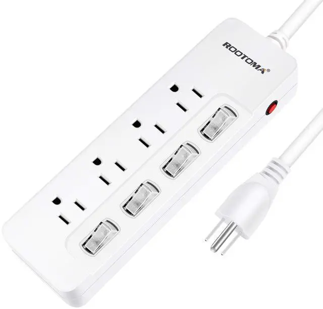ROOTOMA individual switch surge protector power strip with 4 AC outlet and circuit breaker fire proof mulitiple protection mountable ul1363a ETL 6ft cord