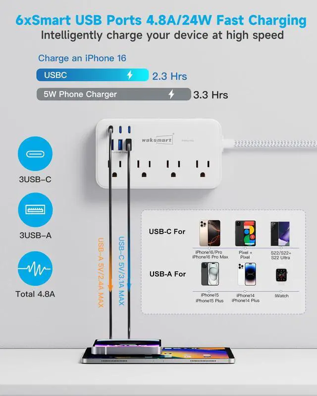 Waksmart 2800J Surge Protector Power Strip 8 AC Outlets with 6 USB Ports