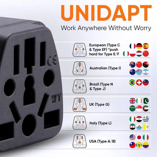 The adapter covers the most common plug types worldwide (including Type A, B, C, E/F, G, I, J, L).