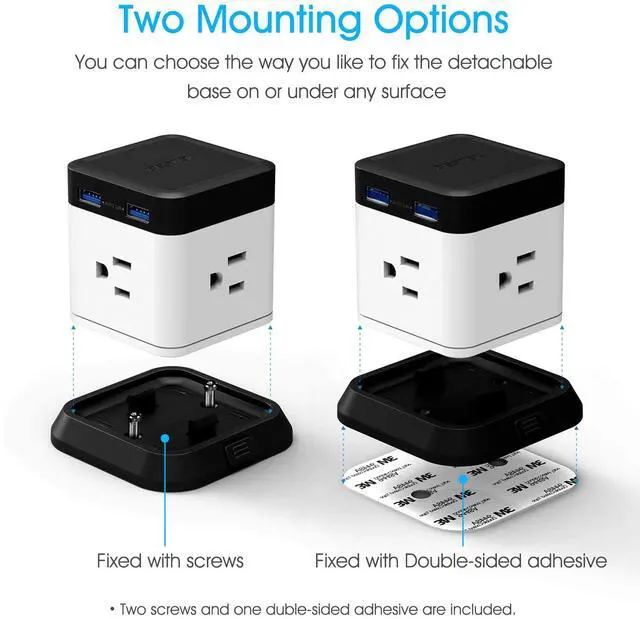 - Two mounting options are available for fixing the detachable base: with screws or double-sided adhesive.