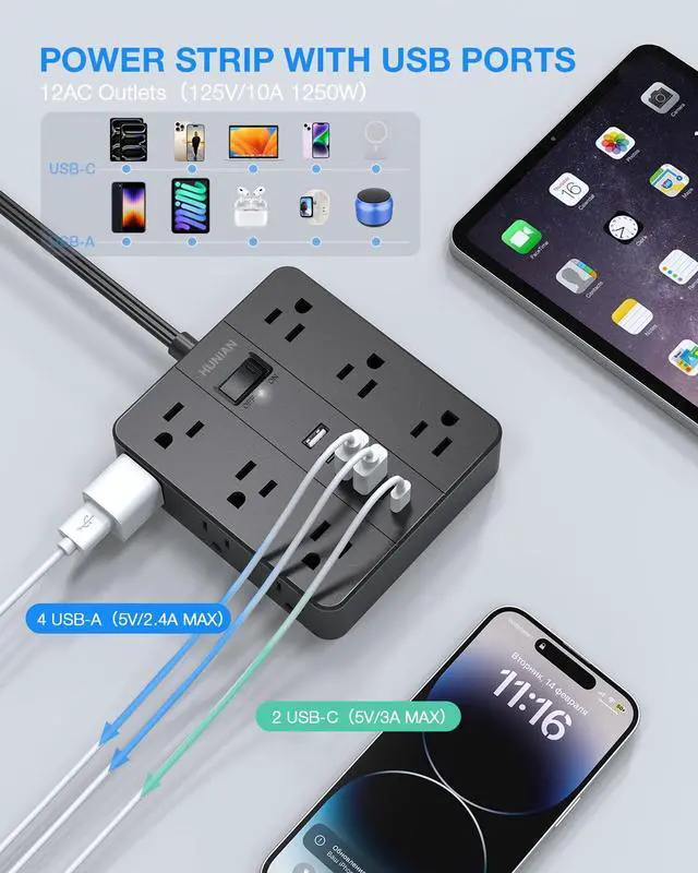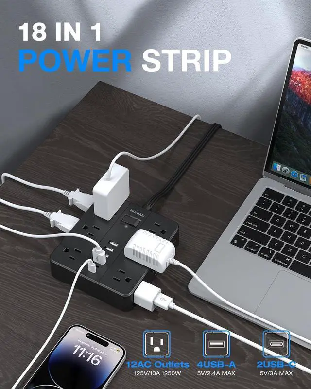 power strip's 3-sided design saves space and allows easy access, preventing plugs from blocking outlets