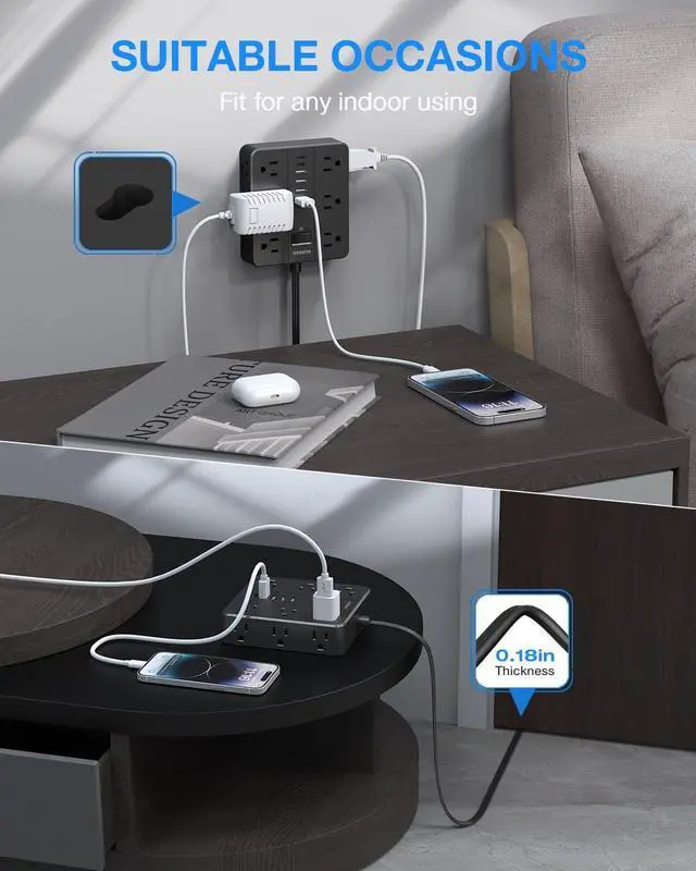 Flat plug could be easily hide in the back the furniture, bed and refrigerator, which can maximizing your outlet space