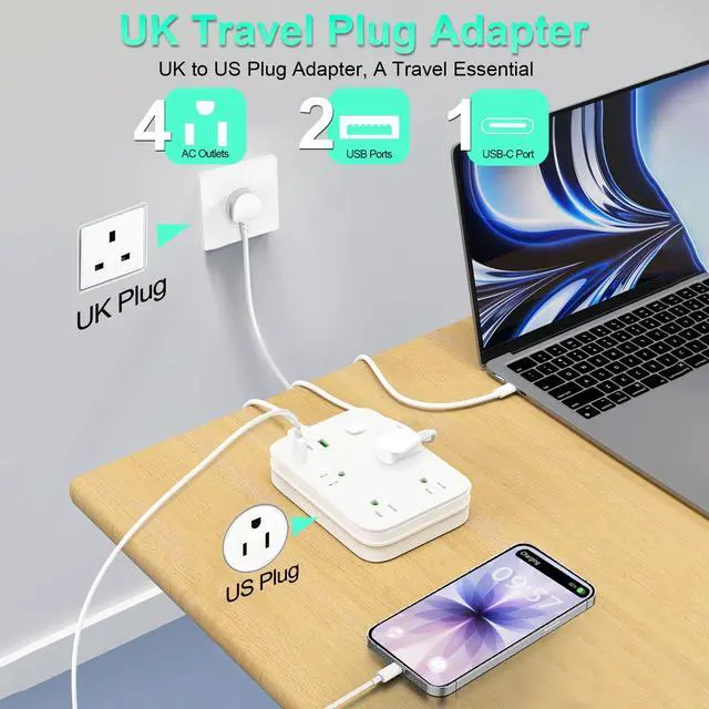 CARZONJX 7 in 1 UK Power Strip: This UK to US plug adapter includes 4 AC outlets and 3 charging ports (1 USB C + 2 USB), eliminating the need for other plug adapters and keeping your desktop organized. The 4 US outlets (10A/2500W MAX) and 3 charging ports (3.1A/15W MAX) make it essential for travelers, businesspeople, and students visiting eligible areas.