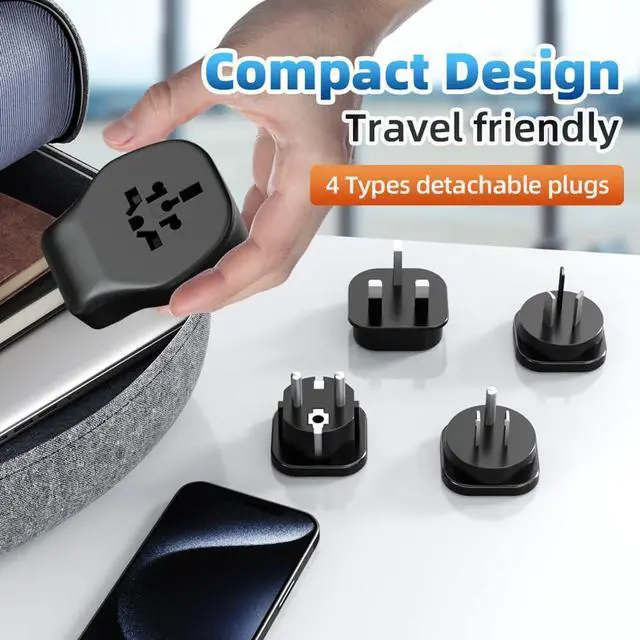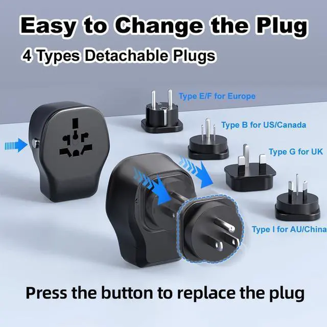 Universal Plug Adapter Kit with Type B/E/F/I/G Detachable Plug, Worldwide Power Socket with 2xUSB-C+1xUSB-A and 4 AC Outlets for US/Canada/AU/UK/Europe/China Travel Adapter (1 Pack Black)