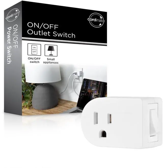 The Cordinate Grounded Outlet Switch is an incredibly energy efficient way to declutter your workspace, control your electronics and save money on utility bills. The outlet switch plugs directly into a three-prong grounded receptacle to provide a convenient ON/OFF switch to any hard-to-reach lamps, appliances, indoor holiday lights and other household items. Having to unplug these items to turn them off can be a hassle and a danger. Skip the cluttered mess and control your devices with the flip of a switch. This plug-in is also great for electronics like TVs, microwaves ovens or air conditioners that use standby power to draw energy when not in use. When the unit is set to the OFF position, rest assured that your appliances are not using any energy. The slim profile of the switch allows two units to be plugged into one standard receptacle to create a centralized powering station at a home or office desk, workstation or counter. The sophisticated and innovative design of this unit is accentuated by the white finish that blends in with your outlet to accentuate interior décor. Dont throw your money away! Use a Cordinate Grounded Outlet Switch to ensure youre not wasting energy on appliances you arent using.