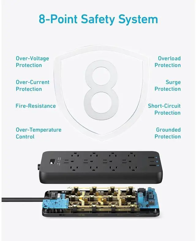 8-Point Safety System: Combines surge protection, fire resistance, overload protection, temperature control, and more to protect you and your devices