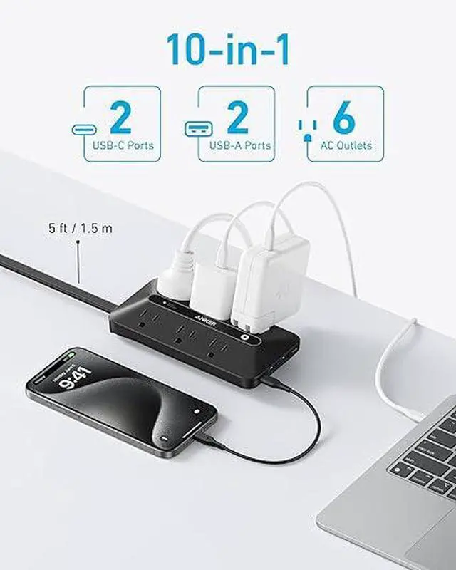 10-in-1 Power Hub: Equip yourself with 6 AC outlets, 2 USB-A ports, and 2 USB-C ports for efficient multitasking and quick charging.