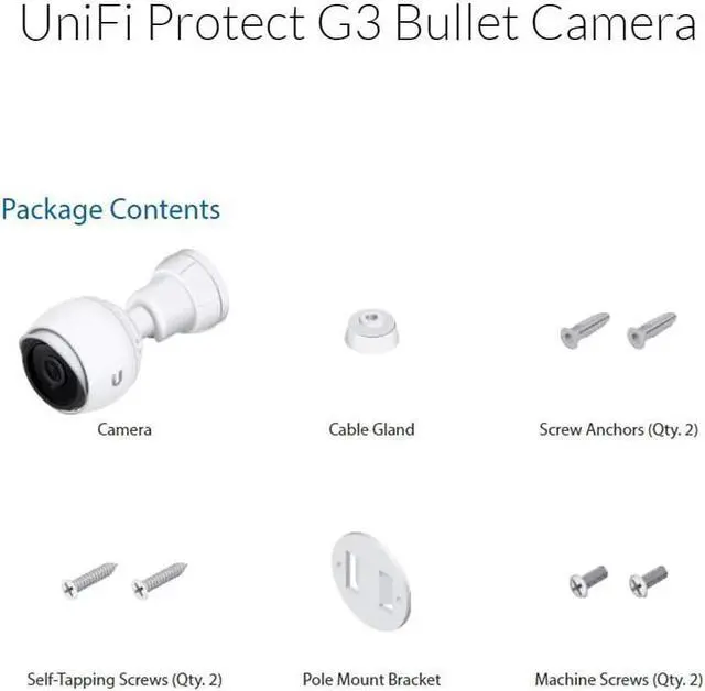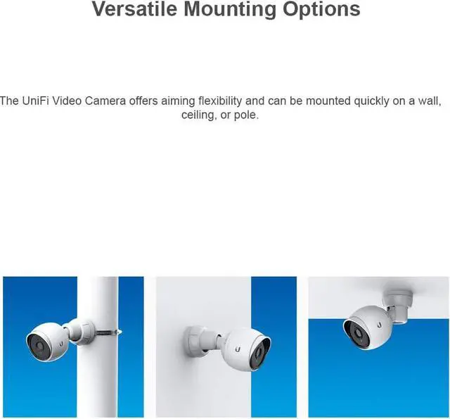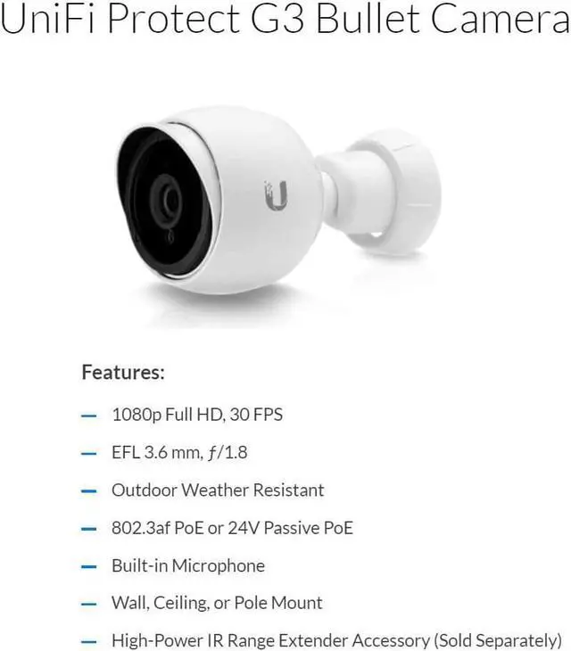 The UniFi G4 Series 4MP Bullet Camera from Ubiquiti Networks. This unit uses a CMOS sensor to capture 2688 x 1512 resolution at 24 fps. The camera features an IR LED for visibility in low-light conditions, a fixed lens that delivers an 86deg horizontal field of view, and a built-in microphone to pick up audio. Integrated PoE technology simplifies connectivity by transferring data and power over one cable. The UniFi Protect app for iOS and Android enables remote management. This camera is housed in an IPX4- and IK04-rated enclosure for protection from water and impact.