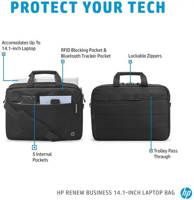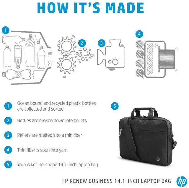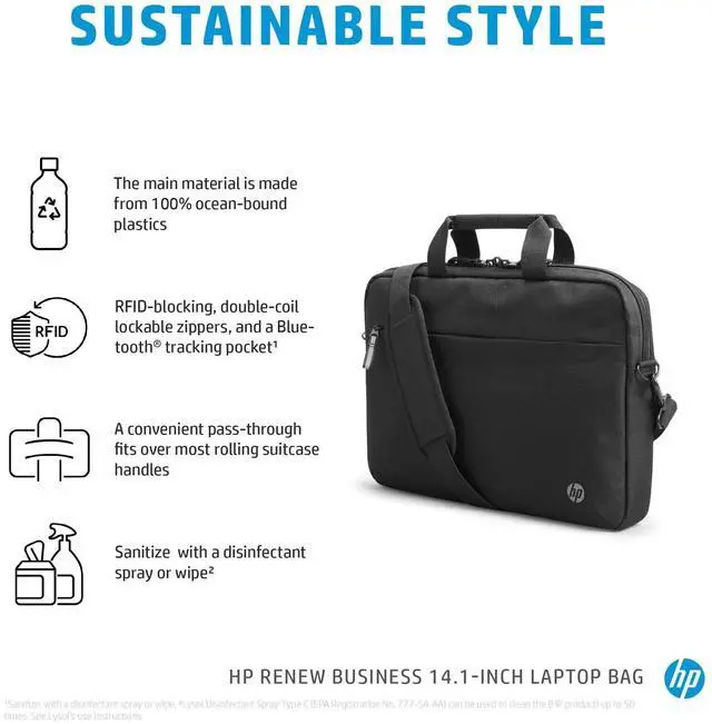 Physical Characteristics Weight (Approximate) 11.29 oz General Information Product Type Carrying Case Manufacturer Part Number 3E5F9AA Manufacturer HP Inc. Product Name Renew Business 14.1 Laptop Bag Product Line Renew Brand Name HP Product Information Maximum Screen Size Supported 14.1" Miscellaneous Application/Usage Accessories Notebook Compatibility HP - Elite Dragonfly G2 Brand Compatibility HP