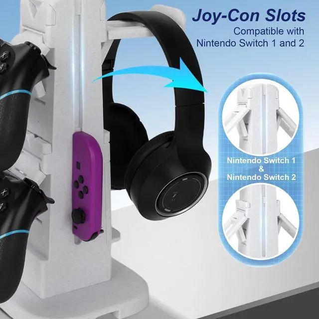 ALL-IN-ONE VERTICAL STORAGE FOR GAMERS: Keep your entire gaming setup neat. This dedicated controller holder safely cradles up to 4 gaming controllers (PS4, PS5, Xbox, or Switch) alongside your main headset stand (or headphone stand).