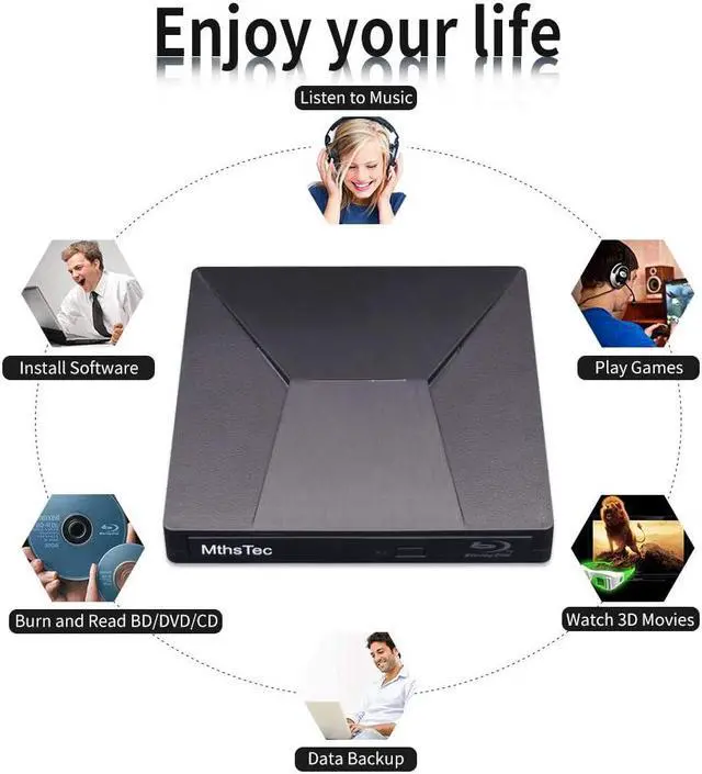 Easy to Use --- The MthsTec external bluray burner can read and write CD, DVD, BD. Powered by USB or TYPE-C, no separate power supply is required. The body has an eject button, no need to install any drivers. Simply press the eject button and place the disc into, and plug the Blu-ray DVD drive into your computer USB interface. Then you can enjoy the wonderful time.