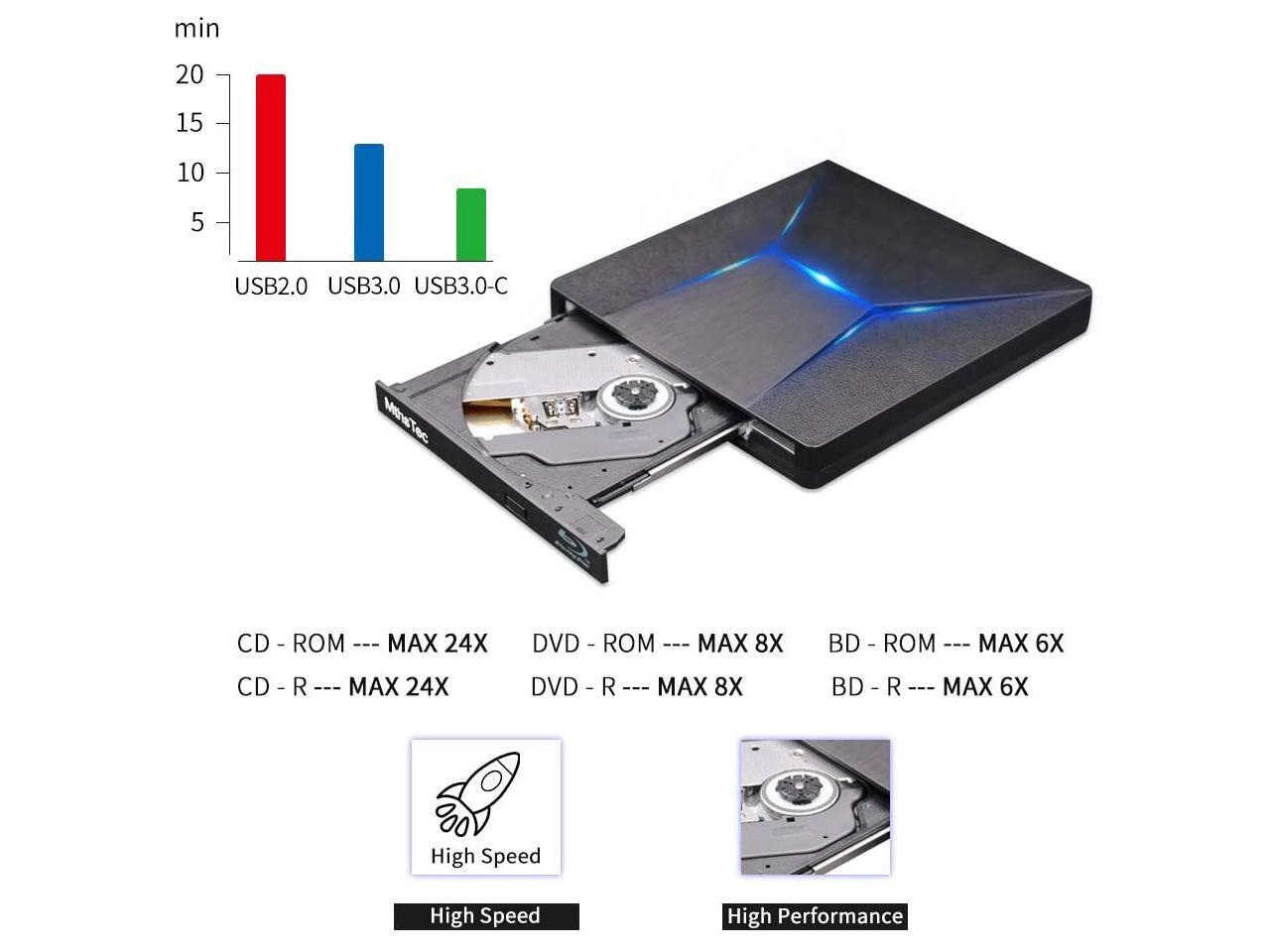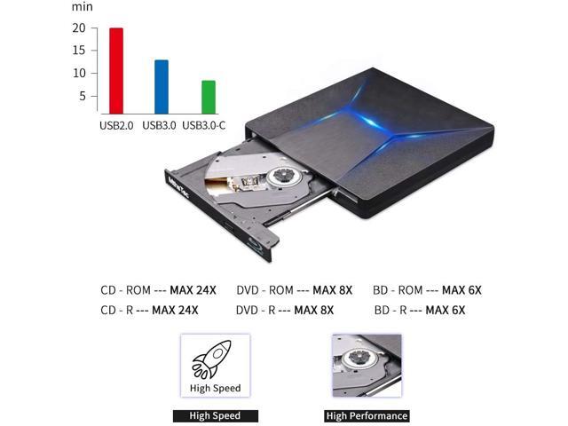 - Latest HD Burning Technology --- The external blu ray drive has a larger storage capacity and a faster reading and recording speed. Blu-ray reading speeds are up to 6x, DVDs up to 8x, and CDs up to 24x. Supports 8.5G 4.7G 700M CD DVD burning capabilities. Advanced high speed 3.0 interface,up to a maximum of 5Gbps(6X faster than 2.0(480Mbps)) & Type-C interface has strong error correction ability, impact resistance, low noise and low power consumption.