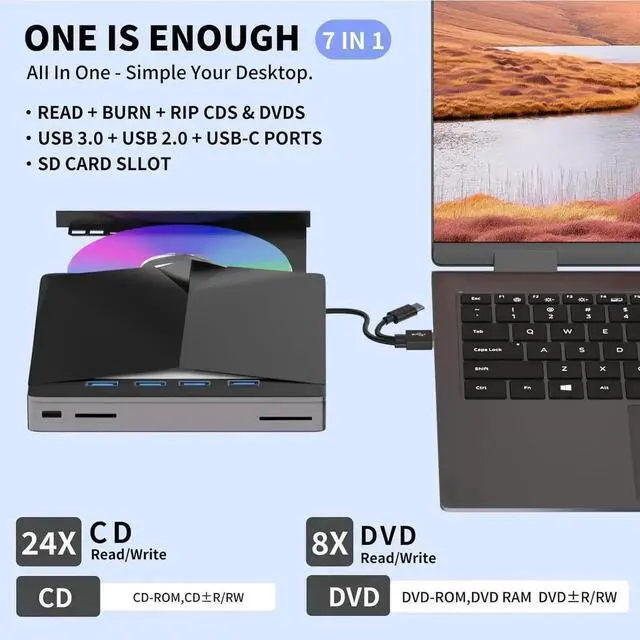 ![Alt view image 7 of 7 - JAENFONG External CD DVD Drive for Laptop [7 in 1], Portable DVD Player for Laptop, USB 3.0 Type C External CD Burner +/-RW CD ROM DVD Drive, CD Reader Compatible with Windows 11/10/8/7 Linux, Mac OS](https://c1.neweggimages.com/productimage/nb640/C1DRS2510090FQMD0E1.jpg)