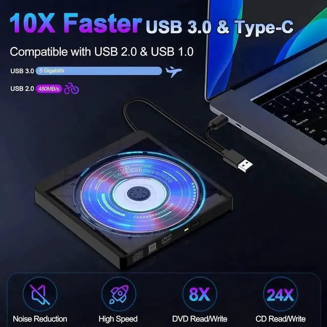External DVD drive for laptop allows you to experience data transfer speeds of up to 5Gbps, which is 10 times faster than USB 2.0. Embedded design stores data cables on the back of the drive without worrying about loss. The length of the USB CD/DVD drive external cable is approximately 10 inches.