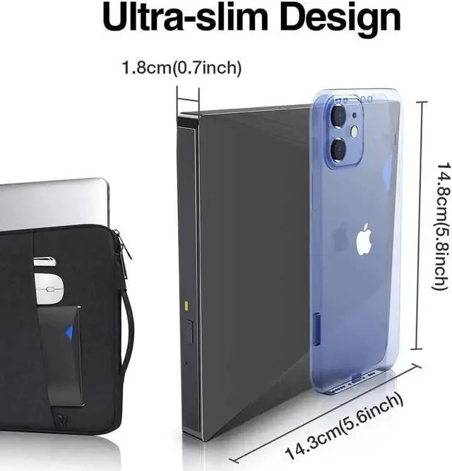 The product size is 5.8*5.6*0.7 inches. Ultra thin and compact DVD drive(detachable cable), lightweight; Easy to carry or store up whether at home or traveling.