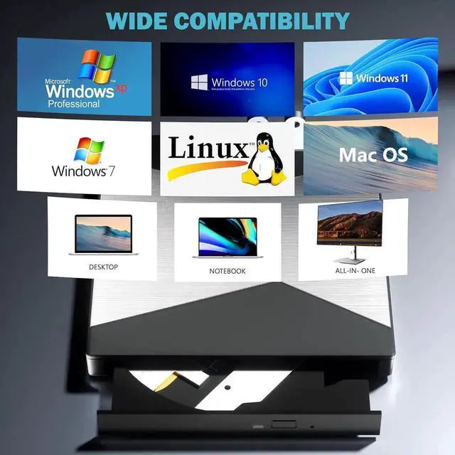The portable blu ray drive external has been designed to be fully compatible with a wide range of operating systems. It has support for Windows 10, 11, XP, and Vista as well as Linux, and all versions of MAC OS 10 or higher. This bluray drive external is not compatible with cars, projectors, tablets, iPads, mobile phones, etc., as it can only work when connected to a laptop or desktop.