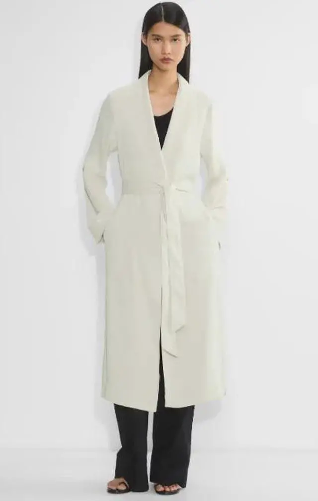 A Babaton staple that combines the ease of a robe with the polish of a blazer, this is a wrap jacket with a removable belt, patch pockets and side slits. Its cut from drapey matte satin thats made with recycled materials.