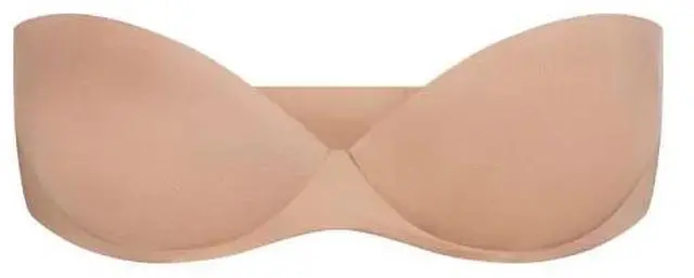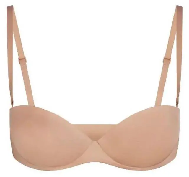 The SKIMS Ultimate Push-Up Strapless Bra in Clay (32D) is a versatile, high-performance bra featuring a strapless design with removable, convertible straps for multiple styling options. It is engineered to provide significant lift and shape using lightweight foam pads and a cushioned underwire.