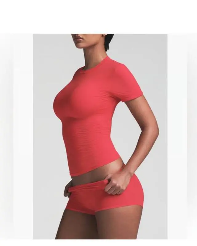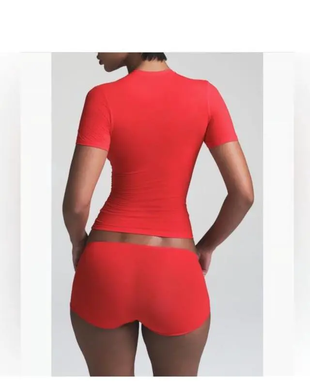The Skims Fits Everybody Short Sleeve T-Shirt in "Cherry" is a "high-performance" wardrobe masterpiece, meticulously engineered to provide "unrivaled stretch" and a "perfectly seamless" silhouette. This "sophisticated and buttery-soft" essential offers the "ultimate strategy" for a "vibrant, fresh" pop of color, making it an "extraordinary staple" for those who desire "impeccable comfort" and a "polished and professional" aesthetic that remains "focused and fresh" throughout your day.