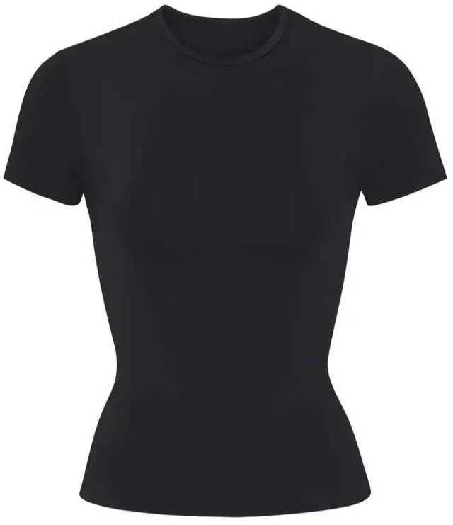 Skims Soft Smoothing Seamless T-Shirt, Eclipse, Medium \n \nCrew neck short sleeve t-shirt, Perfect for light smoothing under clothing \n93% Nylon / 7% Elastane \nHand wash cold, Non-Chlorine bleach, Line dry, Do not iron, Do not dry clean \nImported