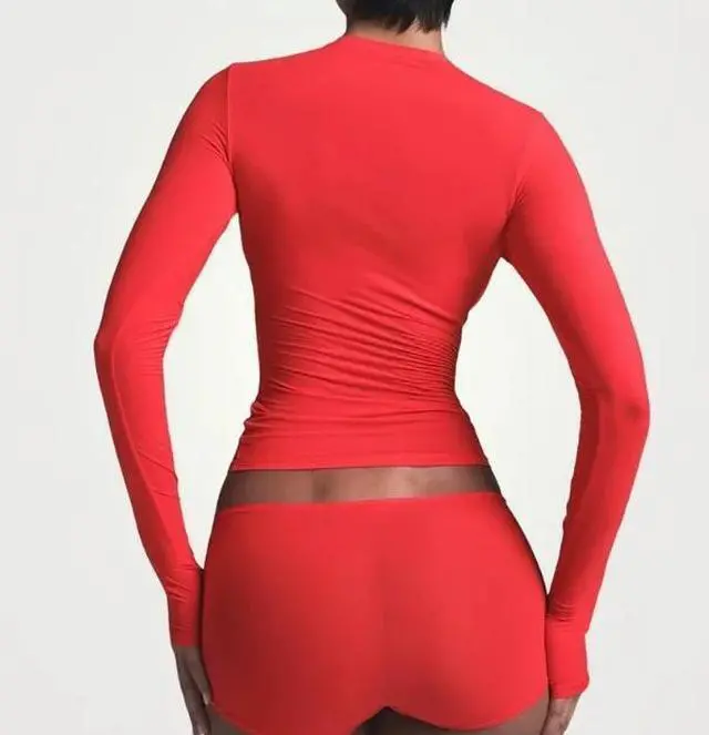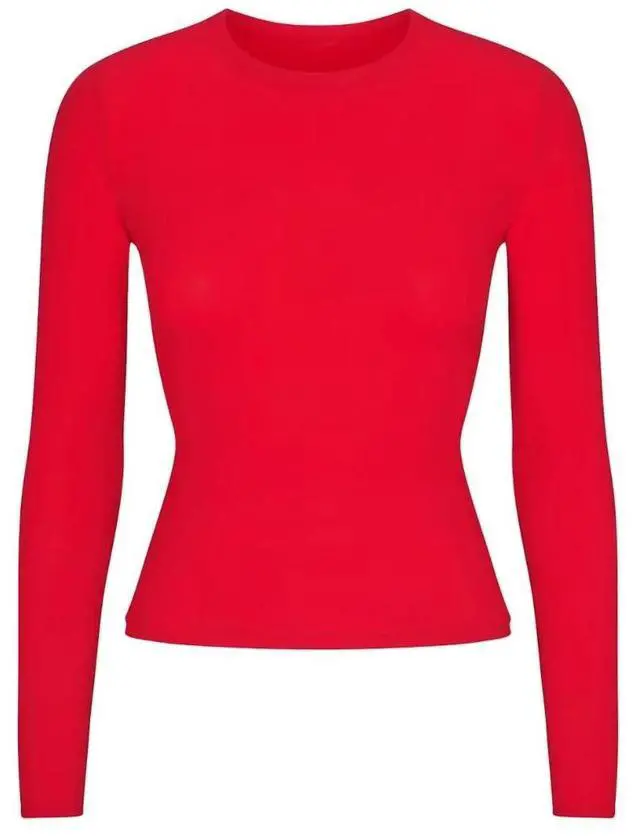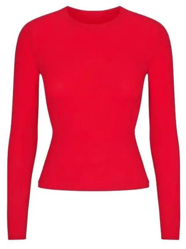 Skims Fits Everybody Long Sleeve T-Shirt, Cherry, Small \n \nBody / Tissu / Principal \n \n76% Polyamide / 24% Elastance \n \nFitted t-shirt, Crew neckline, Single layered \nMachine wash cold, Non chlorine bleach, Cool iron, Do not dry clean \nImported