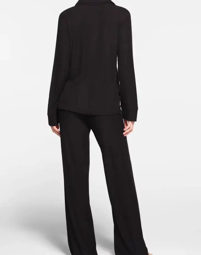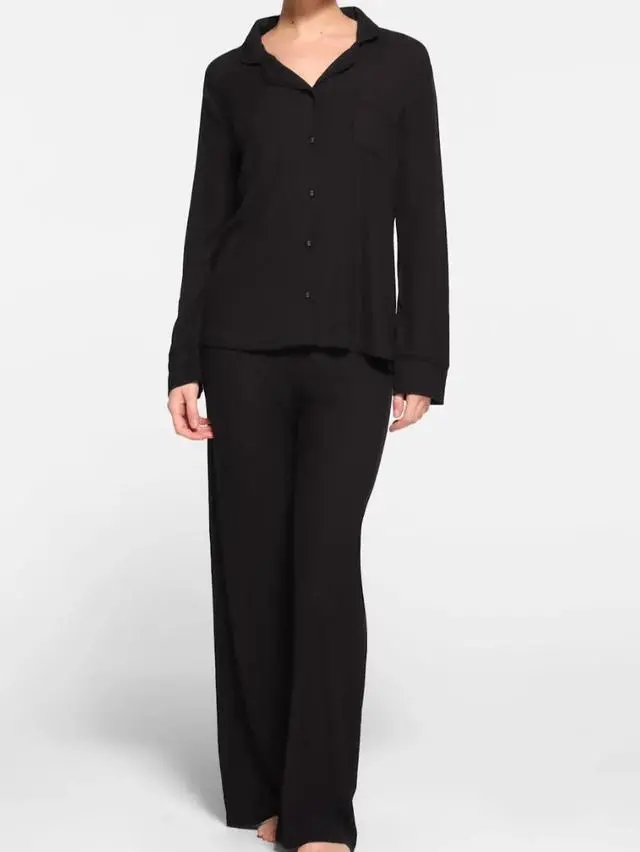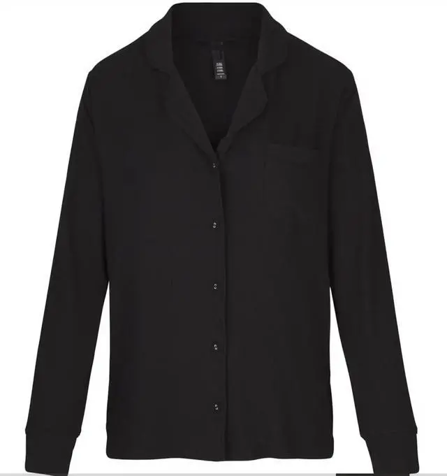 Skims Soft Lounge Sleep Top, Onyx, XS \n \nThis classic top and matching pant make the perfect pajama set. Made with ultra soft modal ribbed fabric, the Sleep Top and Sleep Pant are a lightweight, comfortable sleep and loungewear option. \n \nClassic Menswear inspired sleep top, Front Button Closure, Chest patch pocket, Locker loops for ease hanging on hooks, Ribbed fabric detail \n91% Modal / 9% Elastane \nMachine wash cold with like colors, Non-Chlorine bleach, Lay flat to dry, Low iron as needed, Do not dry clean \nImported