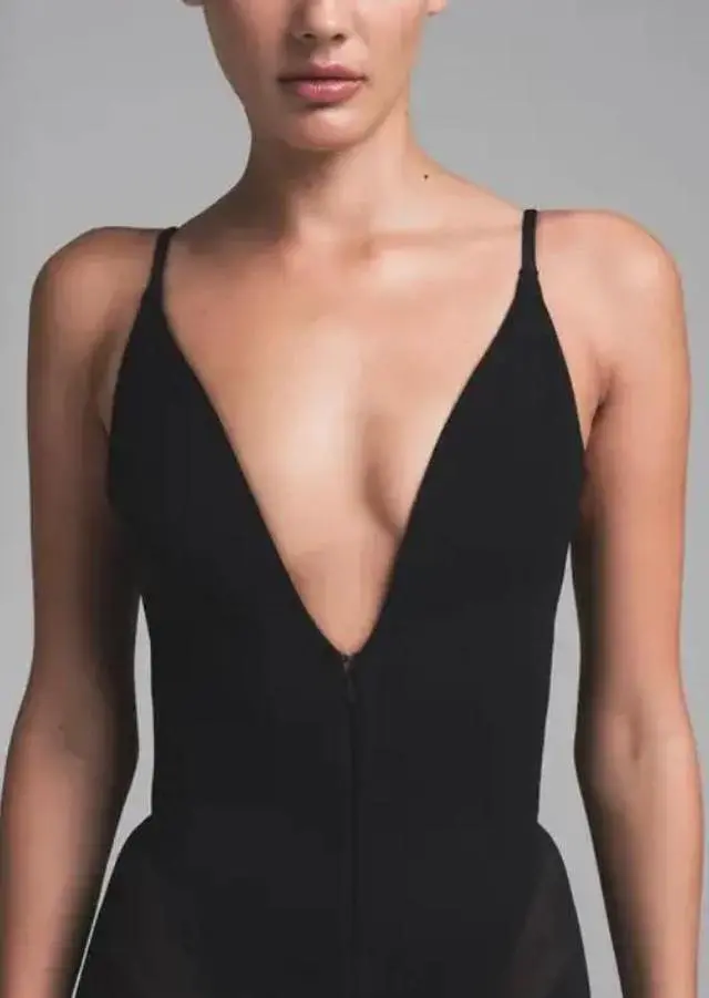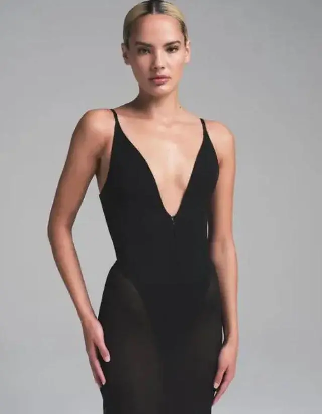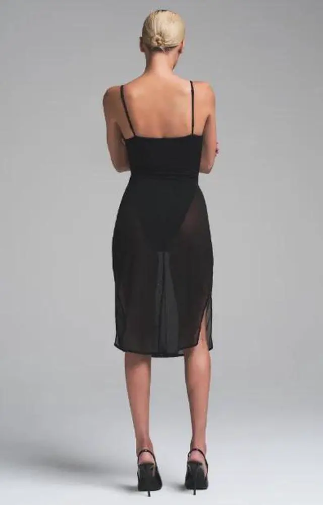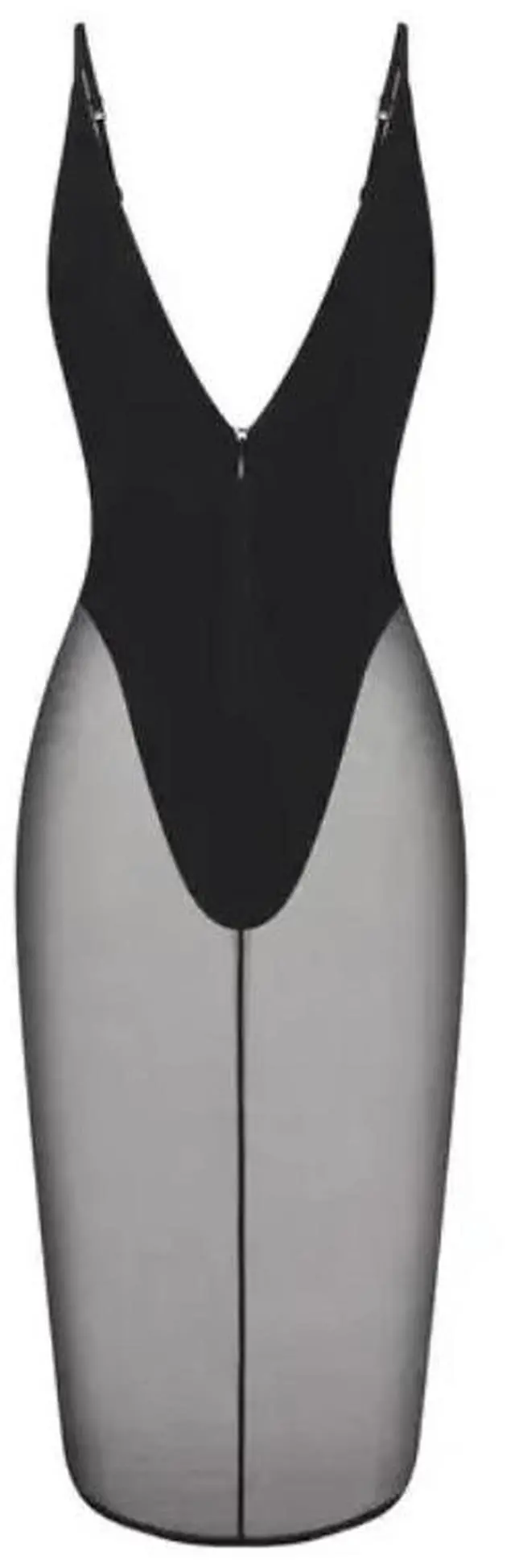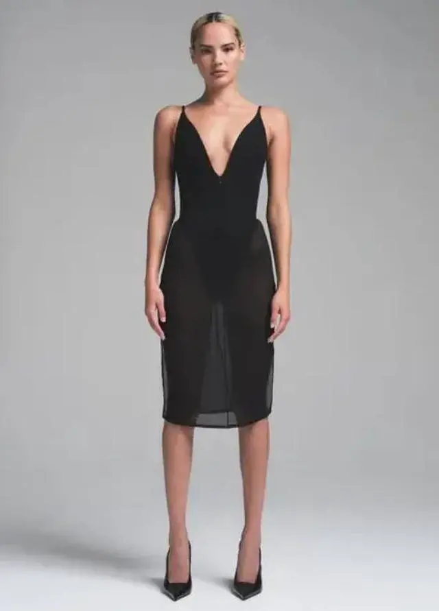 All eyes on you. Own the night in this plunge midi that combines a power mesh outer layer and our signature SKIMS Body fabric to snatch and smooth your stomach and waist. With a sculpting interior brief bodysuit and daring side slits, this style effortlessly outlines your curves. Includes an invisible zipper front, snaps at the gusset, and adjustable straps for a comfortable fit. Bodysuit sits high on the leg and dress fits true to size. \n \n