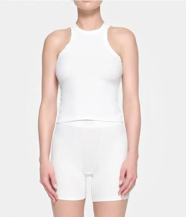 Youve never felt a tank this soft. Made with our signature ribbed modal, this curve-hugging crew neck gives you top-tier comfort while lounging and leaving the house. Features a slight racer front and back and hits below the natural waist. Fits true to size. \n \nGiven the semi-sheer nature of this colorway, we recommend wearing with a SKIMS foundation in your go-to neutral shade. \n \nCrew neckline, Racer front and back, Binding at neckline and armhole, Standard length, Fits tight to body, Length: 20 \n91% Modal / 9% Elastane \nMachine wash cold with like colors, Non-Chlorine bleach, Lay flat to dry, Low iron as needed, Do not dry clean \nImported