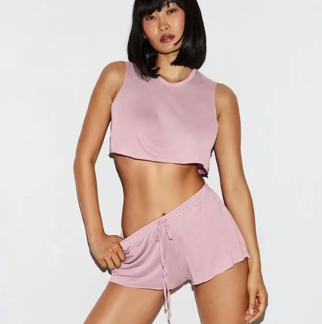 The SKIMS Sleep Super Cropped Tank and Sleep Cheeky Short Set in Orchid is the ultimate lightweight lounge duo, designed for those who prioritize a "barely-there" feel. Crafted from SKIMS' ultra-fine sleep fabric, this set combines a modern, edgy silhouette with a romantic, soft pink hue.