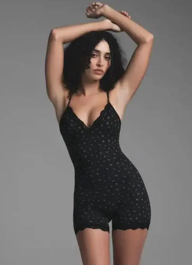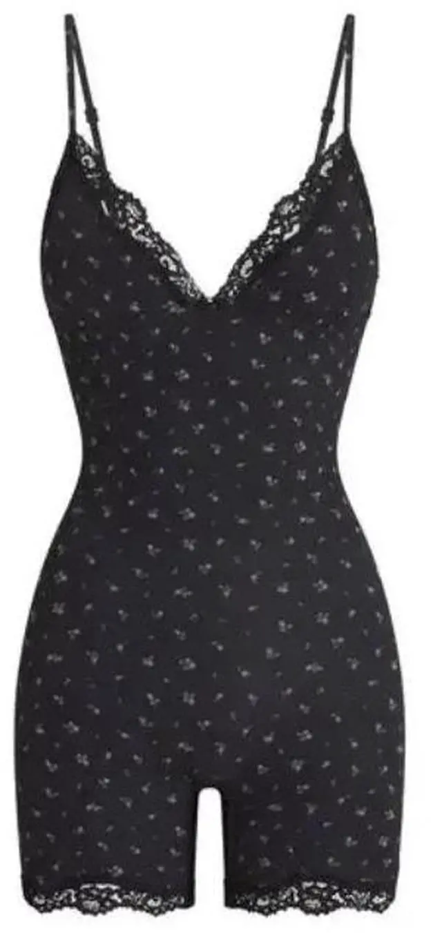 Skims Fits Everybody Lace Triangle Onesie, Onyx Rosebud Print \n \nThis SKIMS onesie features the brand's Fits Everybody Lace fabric. It has adjustable elastic back straps, stretch, a lined gusset, and lace detailing. A miniature bow detail adds a romantic touch.