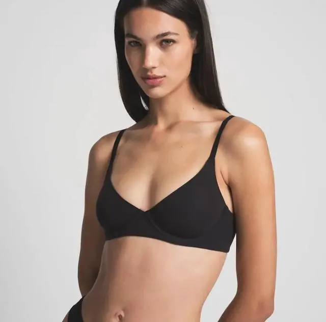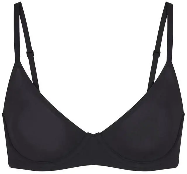 The SKIMS Fits Everybody Scoop Plunge Bra in Onyx (32B) is a masterclass in everyday comfort. It blends traditional underwire support with a "second-skin" feel, providing a smooth, filtered look that disappears under the most form-fitting clothes.